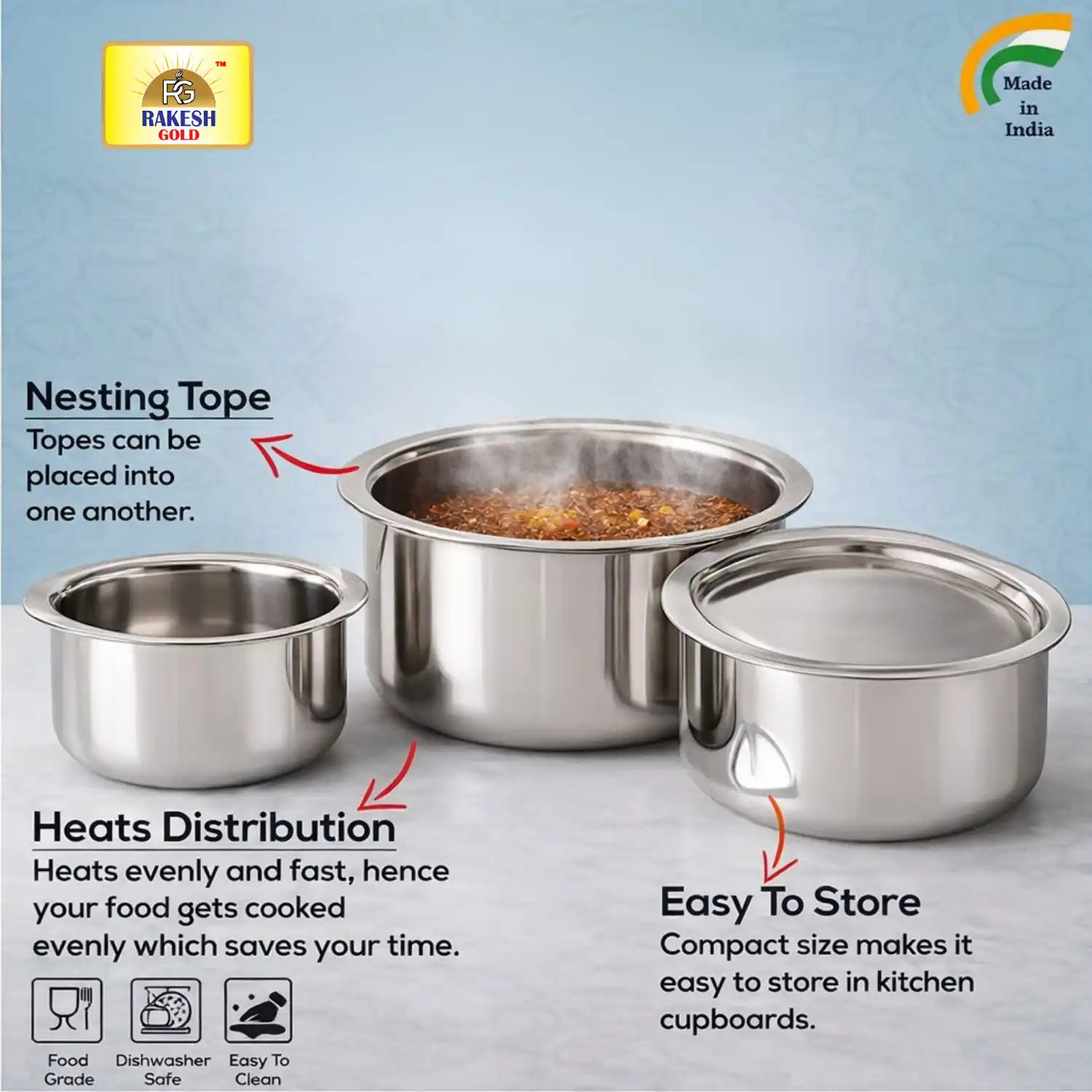 Upgrade your everyday cooking with the Stainless Steel Top Set by Rakesh Gold. We thoughtfully crafted this set to deliver durability, efficiency, and convenience. Specifically designed for the rigorous demands of a modern Indian kitchen, this collection is your perfect partner for boiling milk, making tea, or preparing savory curries.